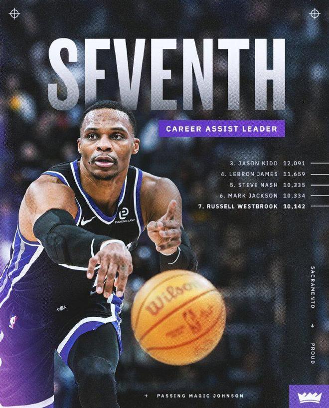 威少生涯助攻超越魔術(shù)師約翰遜,升至歷史第7位。