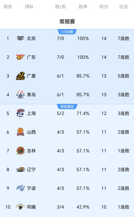 北京時間12月28日晚上,CBA常規(guī)賽迎來多場比賽,北京男籃、廣東男籃繼續(xù)全勝,穩(wěn)居積分榜前二,衛(wèi)冕冠軍廣廈男籃退居第三,組成爭冠集團(tuán)。另外青島男籃延續(xù)了不俗表現(xiàn),憑借6勝1負(fù)的戰(zhàn)績,殺進(jìn)積分榜前四位。