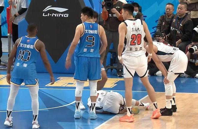 這一幕發(fā)生在第二節(jié)比賽還剩下4分鐘左右的時候,當(dāng)時北京男籃以38-21領(lǐng)先。北京男籃進攻得手后,北京男籃在后場快速發(fā)球,周琦在快下的過程中被背后的薩姆納推了一下,失去平衡后摔倒。巧合的是,周琦倒地后直接撞在了徐杰的左小腿部位,徐杰立刻被周琦撞倒在地。