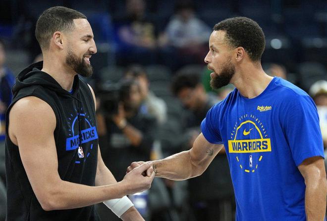 庫里在本場(chǎng)比賽中穿上克萊的簽名鞋,賽前,昔日的水花兄弟有說有笑。