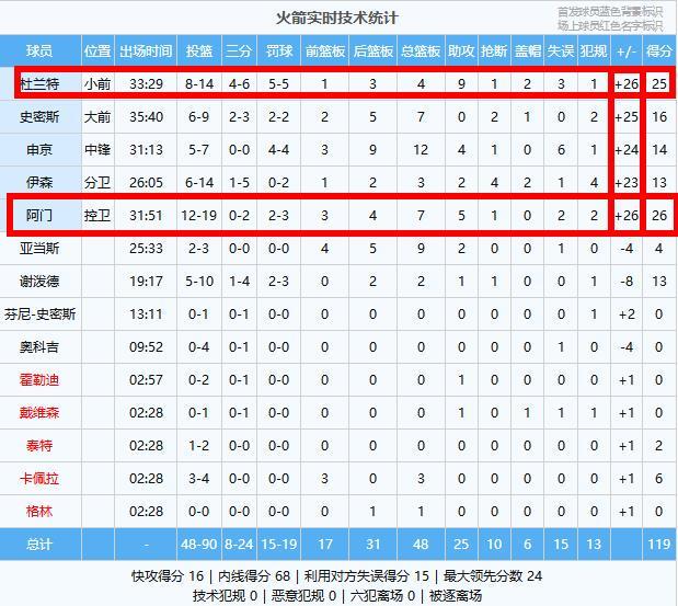 阿門26分7板5助、杜蘭特25分4板9助2帽、史密斯16分7板2斷、申京14分12板4助、伊森13分3板2助4斷2帽、謝潑德13分2板1助、卡佩拉6分3板、亞當(dāng)斯4分9板2助