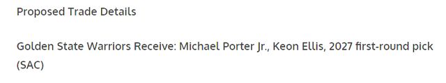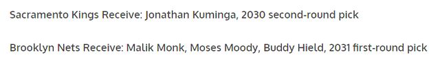 潛在的交易細(xì)節(jié)如下:金州勇士獲得邁克爾·波特二世、基恩·埃利斯、2027年首輪選秀權(quán)(國(guó)王隊(duì));薩克拉門托國(guó)王獲得:庫(kù)明加、2030年次輪選秀權(quán)(勇士);布魯克林籃網(wǎng)獲得:馬利克·蒙克、穆迪、巴迪·希爾德、2031年首輪選秀權(quán)(勇士)。