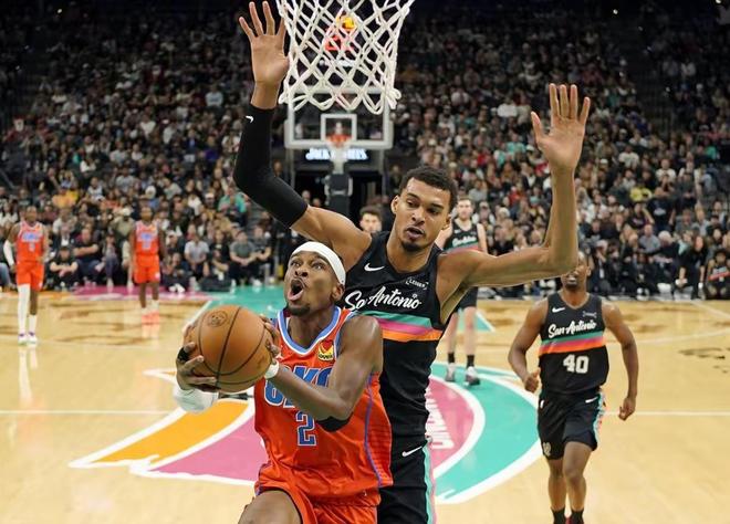馬刺的防守策略堪稱教科書級別。他們對持球人亞歷山大施壓,要么用腿腳靈活的??怂梗从皿w型占優(yōu)的文班亞馬,甚至直接雙人夾擊,逼迫亞歷山大出球。