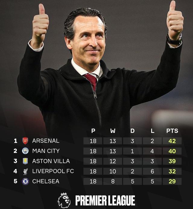 此戰(zhàn)過后,維拉18輪積39分高居英超第3,距離榜首阿森納僅差3分,和曼城只差1分,爭冠勢頭正盛。