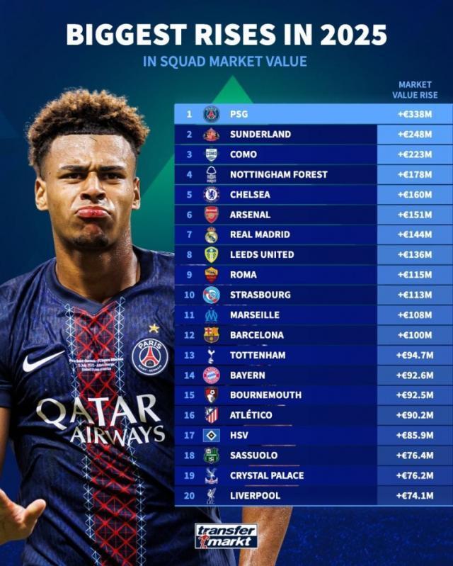 2025俱樂部身價漲幅榜:巴黎+3.38億領(lǐng)跑