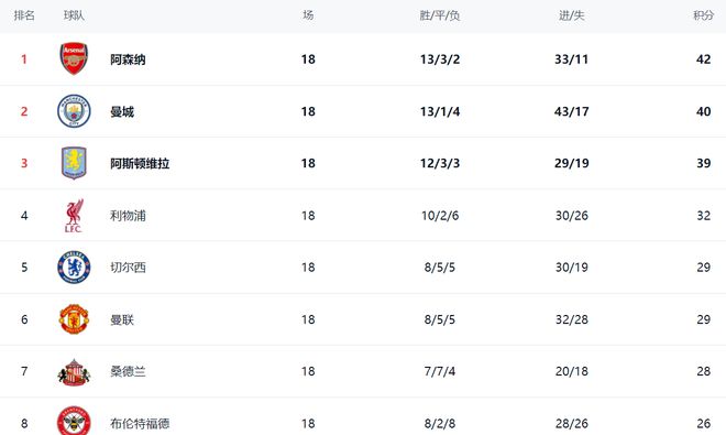 在積分榜上,阿森納的戰(zhàn)績(jī)是13勝3平2負(fù),以42分高居榜首。不過,阿森納的領(lǐng)先優(yōu)勢(shì)很少,身后的曼城追得很緊。曼城總積分是40分,排名第2,只落后阿森納2分。第3名的阿斯頓維拉的戰(zhàn)績(jī)也是極其出色,拿到39分,比阿森納只少3分?,F(xiàn)在的爭(zhēng)冠格局就是三國(guó)鼎立,每一輪比賽的結(jié)果都有可能導(dǎo)致榜首的易主。