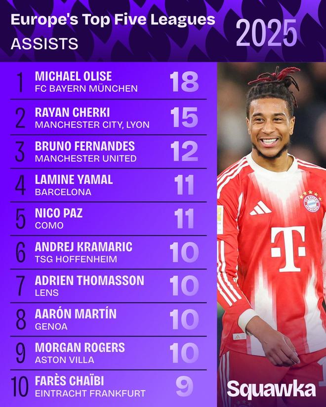 據(jù)知名數(shù)據(jù)網(wǎng)站Squawka統(tǒng)計,2025年歐洲五大聯(lián)賽的助攻排行榜出爐。拜仁邊鋒奧利塞以18次助攻高居榜首,謝爾基以15次位列次席。