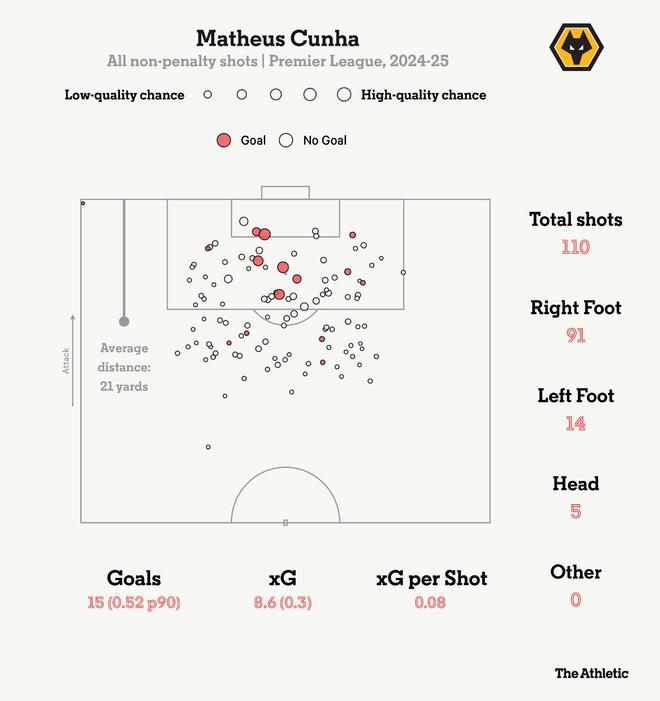正如去年夏天所指出的那樣,庫(kù)尼亞是上賽季xG超額完成最明顯的球員之一,這樣的效率不太可能在老特拉福德持續(xù)。目前,庫(kù)尼亞保持了2024-25賽季的射門(mén)頻率,但進(jìn)球運(yùn)氣有所下降?;仡櫵腺惣镜纳溟T(mén)分布,他既有遠(yuǎn)射,也有在點(diǎn)球區(qū)與六碼區(qū)之間完成的機(jī)會(huì)。在加盟曼聯(lián)的首個(gè)賽季進(jìn)行到一半時(shí),這些行為模式仍在出現(xiàn),但成功率有所降低。