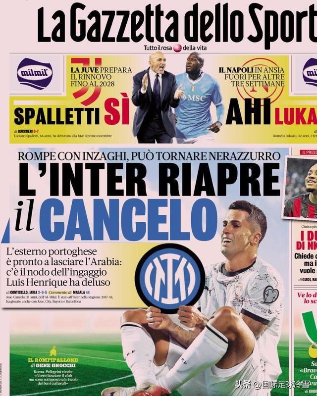 天空臺的跟隊記者比較務(wù)實,指出:目前坎塞洛在利雅得新月的年薪是1800萬歐元(沙特的球員幾乎不用繳納個人所得稅),半年就是900萬歐元純收入。國米顯然不可能提供如此高薪,因為算上稅款,這半年就是一大筆錢。