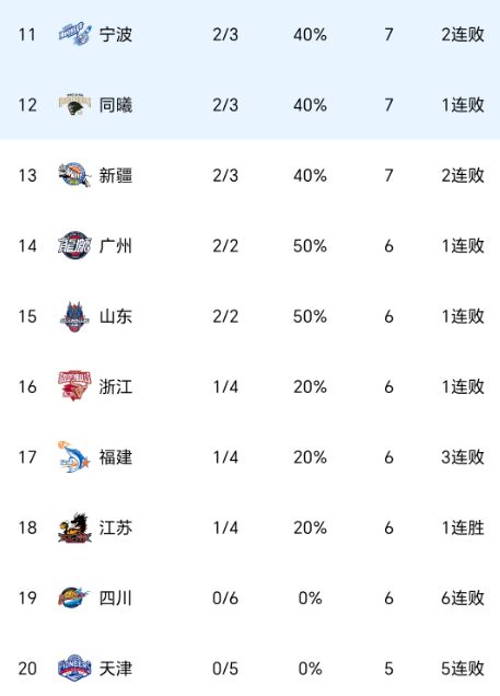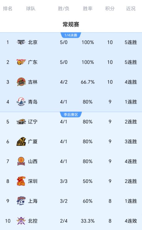 從以上積分榜來看,聯(lián)盟只有北京隊(duì)、廣東隊(duì)開局五連勝,吉林隊(duì)多賽一輪4勝2負(fù)升入第三,青島隊(duì)、遼寧隊(duì)、廣廈隊(duì)、山西隊(duì)都是4勝1負(fù)的戰(zhàn)績。此外,全敗球隊(duì)僅剩天津隊(duì)、四川隊(duì)。