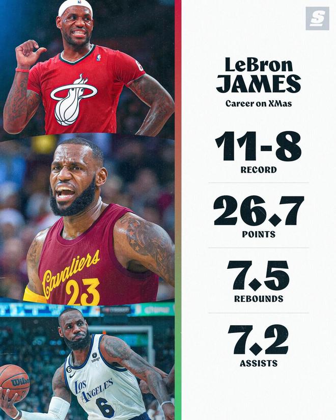 北京時間明日,一年一度的NBA圣誕大戰(zhàn)即將打響。今日,美媒曬出了湖人球星勒布朗-詹姆斯的圣誕大戰(zhàn)數(shù)據(jù)。