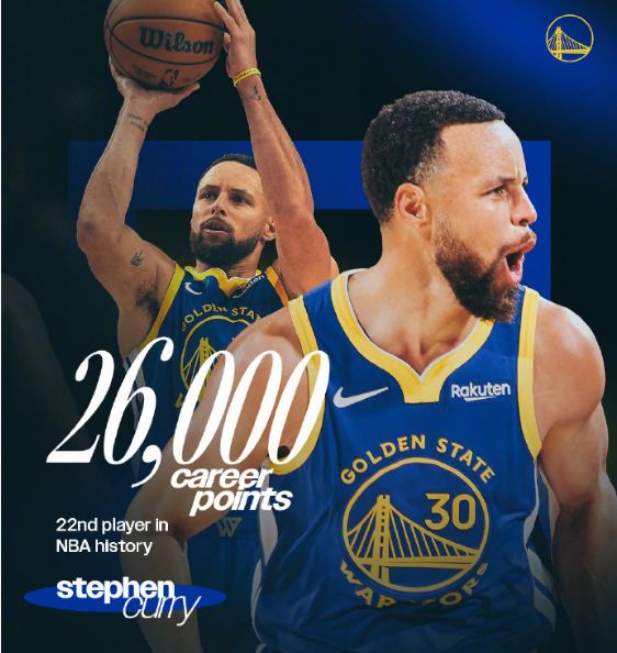 庫里達成NBA生涯常規(guī)賽26000分里程碑,成為歷史第22位達成該榮譽的球員。