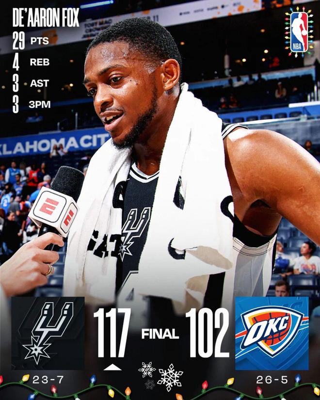 圣誕大戰(zhàn),馬刺客場(chǎng)117-102戰(zhàn)勝雷霆。