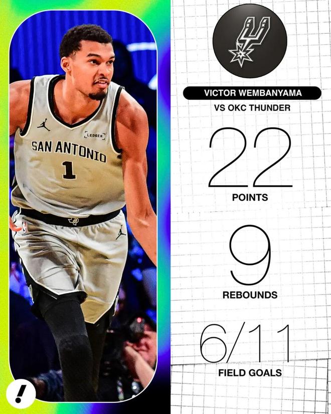 ——兩隊(duì)第一次交手在NBA杯半決賽,那場(chǎng)馬刺最多落后16分,文班亞馬替補(bǔ)成為奇兵(只打了20分鐘,拿了22分9籃板2助攻,正負(fù)值+21),馬刺111-109險(xiǎn)勝雷霆2分