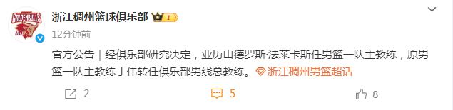 如今浙江男籃官方公告寫道:“官方公告|經(jīng)俱樂部研究決定,亞歷山德羅斯-法萊卡斯任男籃一隊主教練,原男籃一隊主教練丁偉轉(zhuǎn)任俱樂部男線總教練。”