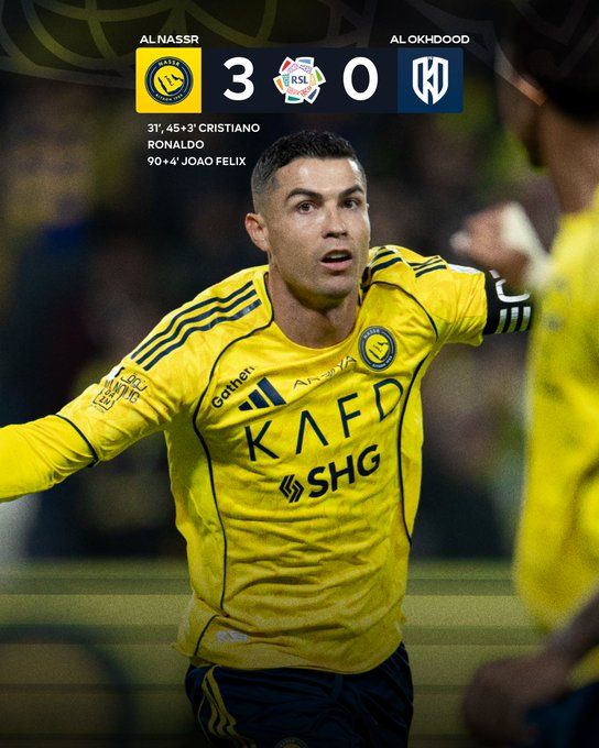 北京時(shí)間12月27日22:50,沙特聯(lián)第11輪,利雅得勝利主場(chǎng)迎戰(zhàn)阿科多。上半場(chǎng)C羅梅開二度+斬獲生涯第956球,下半場(chǎng)C羅進(jìn)球越位無效,菲利克斯補(bǔ)時(shí)錦上添花。最終利雅得勝利主場(chǎng)3-0戰(zhàn)勝阿科多,勝利聯(lián)賽開局豪取10連勝+4分優(yōu)勢(shì)領(lǐng)跑。