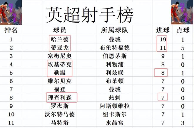 射手榜方面,哈蘭德19球繼續(xù)穩(wěn)居榜首,蒂亞戈11球位列第2,塞梅尼奧9球排在第3。勒溫今天打入一球,追上埃基蒂克,兩人8球并列第4。理查利森今天打入2球全被吹掉,還是和福登,馬特塔,羅杰斯等人7球剛好擠入前十。