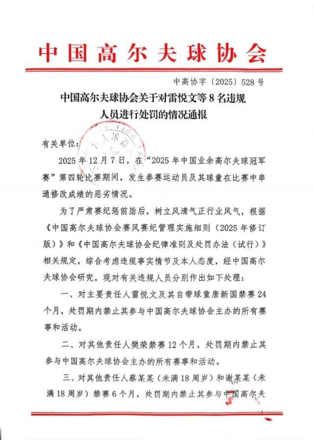 12月19日訊 中國高爾夫球協(xié)會發(fā)布情況通報,在“2025年中國業(yè)余高爾夫球冠軍賽”第四輪比賽期間,發(fā)生參賽運(yùn)動員及其球童在比賽中串通修改成績的惡劣情況,對涉事人員處以最高禁賽2年的處罰。