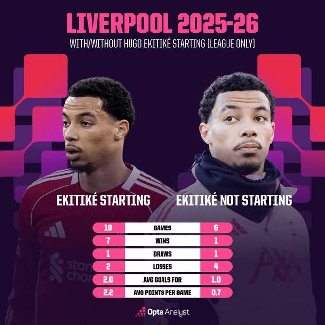 埃基蒂克本賽季英超首發(fā)時利物浦10戰(zhàn)7勝,未首發(fā)時6戰(zhàn)4負